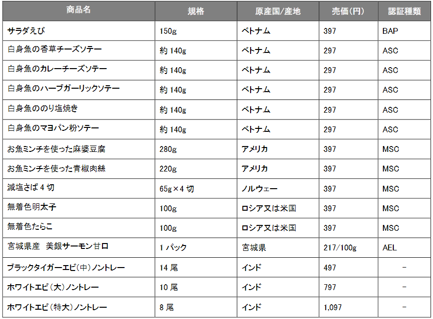 さらに「焼くだけ」 「炒めるだけ」の加工済み半調理品への需要の高まりを受け、ASC認証などの水産エコラベル認証を得た「白身魚のハーブガーリックソテー(140g/税抜297円)」、「お魚ミンチを使った麻婆豆腐(280g/同397円)」など11品目や、環境に優しいノントレー商品として「ホワイトエビ(10尾/同797円)」を含めた3品目の発売も開始する。