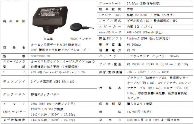 一つは、「オービス位置データ&GPS 機能対応360°撮影カメラ搭載ドライブレコーダー」 税抜1万4800円。2019年発売した「360°撮影カメラ搭載ドライブレコーダー」に、オービス位置データとGPS機能を追加した。オービス(ORBIS)とは速度違反自動取締装置。その位置に近づくと、制限速度を音声で知らせて安全運転を促す。GPS機能では日時・場所・走行ルート・速度などのデータを、映像と一緒に記録できるようになった。