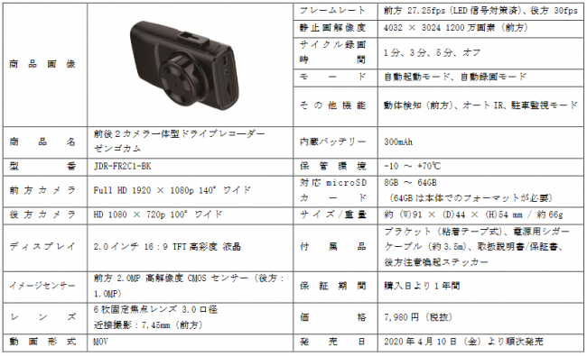 もう一つは「前後2カメラ一体型ドライブレコ―ダー ゼンゴカム 」税抜7980円。車の前方と後方の撮影に特化して買いやすい価格とした。前方カメラはフルHD画質で、ナンバープレートをしっかりと識別できる。また、後方カメラは車内が暗くなると自動で赤外線仕様に切り替わる。