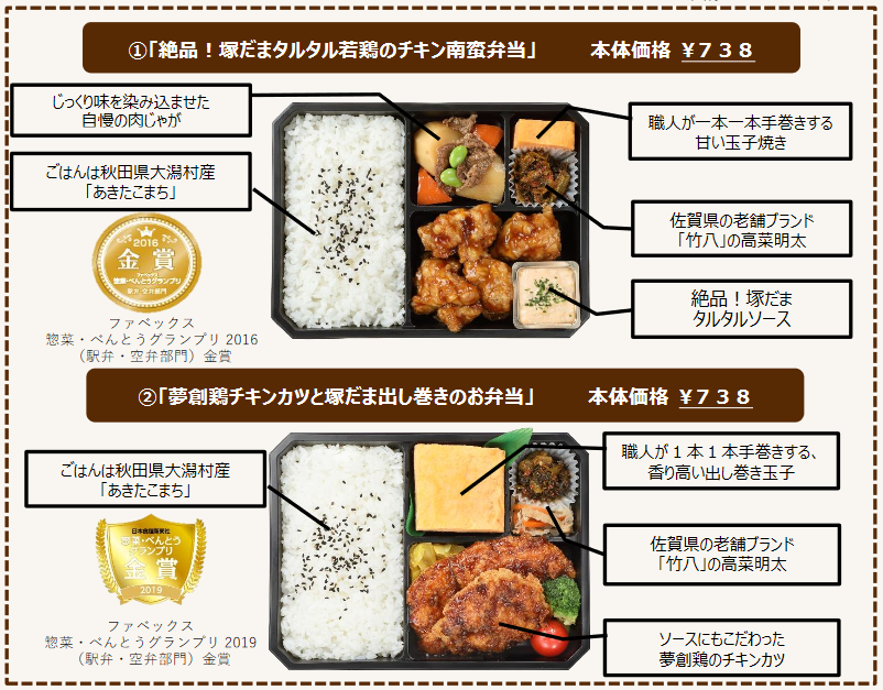 販売する商品は、ファベックス「惣菜・べんとうグランプリ」駅弁・空弁部門で、2016年に金賞を受賞した「若鶏のチキン南蛮弁当」と2019年に金賞を受賞した「夢創鶏チキンカツと塚だま出し巻きのお弁当」。ともに販売価格は738円(税別)。