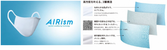 「エアリズムマスク」は、マスクに必要とされる防御性能を高めるため、独自の3層構造を採用した。表側の「メッシュ素材」と、内側の「エアリズム」の中間には、「高性能フィルター」を内蔵した。この高性能フィルターはBFE(バクテリア飛沫捕集)を99%カットでき、飛沫、細菌やウィルスが付着した粒子、花粉などをブロックする。