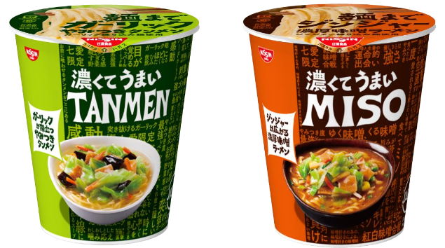 「日清濃くてうまい」シリーズは、麺とスープの濃厚さにこだわった商品。「TANMEN」はガーリック、「MISO」はジンジャーを麺に練り込んだ“旨み練り込み麺”を採用して、麺一本一本にまでしっかりとした味わいに仕上げた。