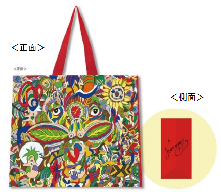 このバッグは、本体部分にリサイクルプラスチックを約50%使用しており、廃プラスチックの活用と、使い捨てプラスチックの削減にもつながる。ジミー大西が「朝の光」をタイトルとしてデザインし、側面にはサインも印字されている。縦39cm×横45cm×マチ20cm。330円(税込み)。このバッグの売上げの10%は、公益財団法人イオン環境財団に寄付され、同財団を通じて植樹をはじめ豊かな地球環境を守る活動に役立てられる。