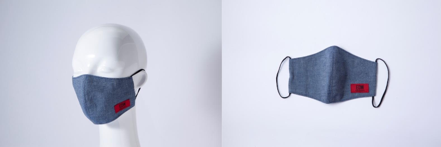 洗えるマスクは。表地は綿100%、裏地はポリエステル65%・レーヨン35%で乾きやすくさらっとした触感の生地を使用。立体縫製によって呼吸がしやすく蒸れにくい。EDWのブランドイメージに合わせたブラックの平ゴムは、やや太めにすることで、耳が痛くなりにくい。