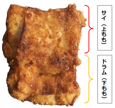 BIG揚げ鶏は、初めて鶏肉の2つの部位を使用する。7月31日(金)に発売予定の揚げ鶏に使用するサイ(上もも)と、現在発売中の「ななチキ」に使用しているドラム(下もも)の2種の部位を使っている。