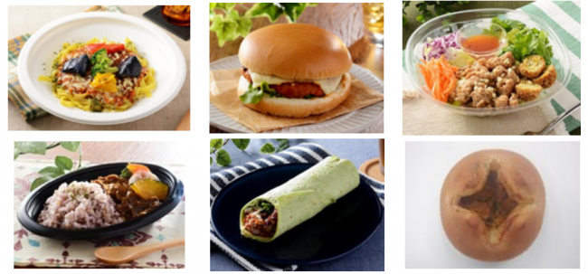 新アイテムは、大豆ミートパスタ(税込499円、以下同)、バジルとトマトの大豆ミートサンド(350円)、大豆ミートとファラフェルのパクチーサラダ(599円)、大豆ミートそぼろ使用のカレーごはん(399円)、トルティーヤ大豆ミートのチリコンカン(330円)、キーマカレー(大豆ミート)~石臼挽き全粒粉使用~(150円)と、女性の好みそうなメニューとなっている。