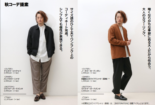 第1弾は秋物として、ドリズラージャケット(3色・税抜価格4990円、以下同)、バンドカラーシャツ(3色・2990円)、ノーカラーカーディガン(3色・2990円)、ワイドテーパードパンツ(3色・2990円)の4アイテムを9月17 日(木)に発売する。