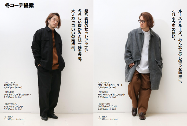 第2弾は冬物として11 月12 日(木)に、CPOジャケット(2色・4990円)、ハイネックワイドスウェット(2色・2990円)、フリースバルカラーコート(2色・5990円)、ワイドタックパンツ(2色・3990円)の4アイテムを発売する。