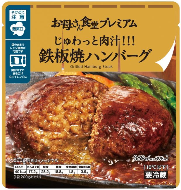 リニューアルされるのは「花椒が決め手の四川風麻婆豆腐」(税抜332円、以下同)、「じゅわっと肉汁!!! 鉄板焼ハンバーグ」(369円)、「旨さ極まる!! 欧風ビーフカレー」(369円)、「7つの隠し味!! 濃厚ビーフシチュー」(369円)、「ごぼうと蓮根のつくね入り和風スープ」(369円)の5メニュー。素材と製法を見直した。