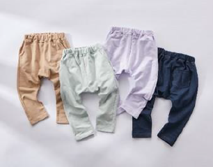 何にでも合わせやすく履くだけでサマになるシルエットのパンツ。快適さとファッション性を両立させた。カラーはブラック、ベージュ、グリーン、パープル、ブルー、ネイビーの6色、サイズは80cm・90cm・100cm、販売価格は790円(税抜き)。