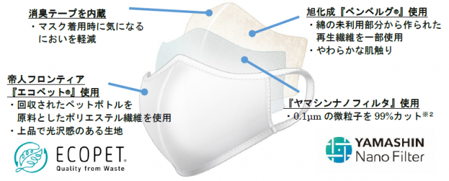 今や日常生活に欠かせないアイテムとなったマスクだが、毎日使うものだからこそ肌に触れても刺激の少ない素材を使い、繰り返し洗っても捕集性能が損なわれないフィルターを使用した。縫製技術の高い日本国内の工場で、マスクの内側に消臭機能のあるテープを縫い付け、新たにつくり上げた。また、立体的な形にすることで、装着時の息苦しさの軽減を図った。