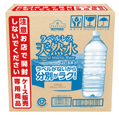 イオン(株)(千葉市美浜区、吉田昭夫社長)は2月2日(火)から、北海道・関東・東海の「イオン」「イオンスタイル」など288店舗で、ペットボトルのラベルを省いた商品「トップバリュベストプライス ラベルレス天然水」のケース販売(2000㎖×6本入り)を開始する。