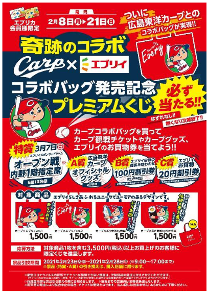 (株)エブリイ(広島県福山市、岡﨑浩樹社長)は、「広島東洋カープ×エブリイ」のコラボトートバッグを製作し、2月8日(月)から、生鮮を扱うエブリイ全42店舗で販売している。地元球団の応援を通して、コロナ禍の今、地域に「夢・希望・元気」を届けたいという想いから企画した。