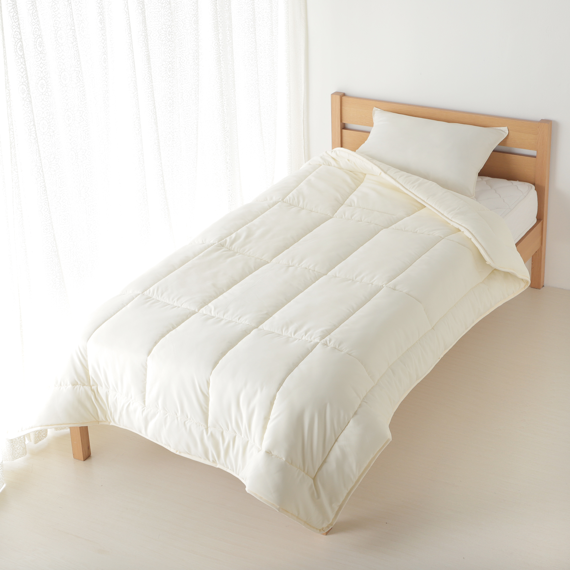 中わたに、フィリピン沿岸地域で回収されたペットボトルを原料にした再生ポリエステルを使用している。製品1枚当たりでペットボトル約40本分のプラスチック(PET)の使用に相当する。
