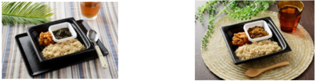 「玄米のダールカレー(レンズ豆)&カシューナッツチキンカレー」は、レンズ豆にターメリック、カルダモンなど8種類のスパイスのダールカレーと、カシューナッツペーストを加えたチキンカレーの2種類を組み合わせた。