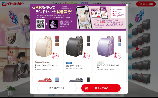 「バーチャル店舗」では、ランドセルのブランドや商品紹介、商品担当者による「ランドセル紹介動画」が視聴できる。さらに専用アプリ(COCOAR)をダウンロードすれば、AR(拡張現実)技術で子どもがランドセルを試着した画像を確認することができる。商品の確認後はイトーヨーカドーネット通販(オムニ7)で商品を購入することも可能。