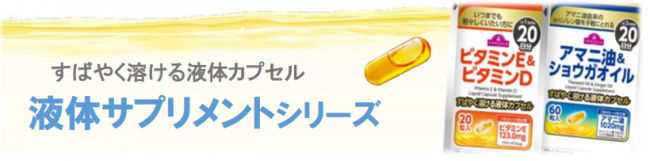 液体サプリメントシリーズは、錠剤やソフトカプセルに比べ、すばやく溶ける「液体カプセル剤型」を採用している。液体カプセルは、カプセルが溶けると同時にすばやく広がる。また、密封性が高く、高密度の皮膜カプセルが、液体の原料の劣化を防ぎ、気になる匂いや味を抑えてくれる。