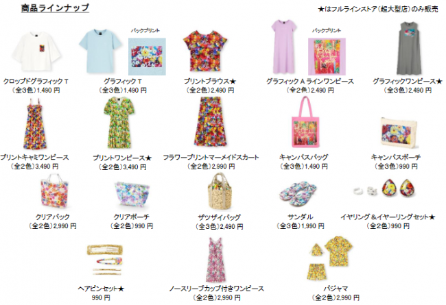 花柄のワンピース、コーディネートしやすいプリントTシャツやプリントワンピース、ブラウスなど、ウィメンズは全18型を品揃えする。また「おうち時間」用のラウンジウェアや、バッグ、ポーチ、アクセサリー、サンダルなどもラインナップする。