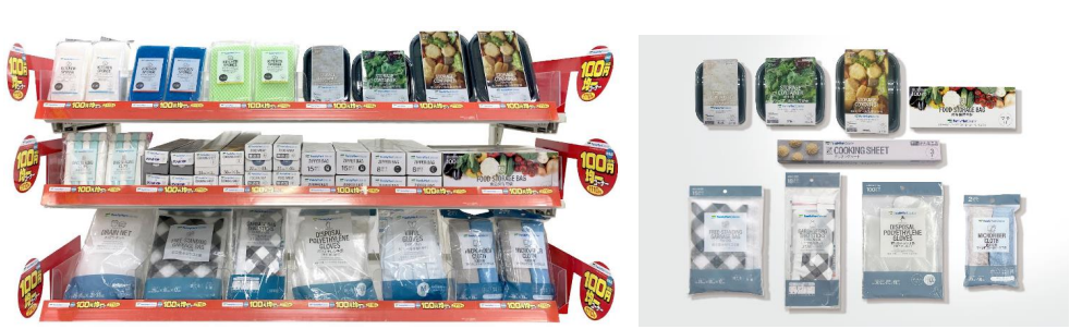 新たに発売されるのは、クッキングシート(30cm×3m)、食品保存容器3アイテム(400ml2個入り/270ml2個入り/180ml3個入り)、自立型水切りゴミ袋(15枚入り)、どこでもペタッとゴミ袋(18枚入り)、食品保存用袋(100枚入り)、ポリエチレン手袋(100枚入り)、マイクロファイバークロス(20cm×30cm)。