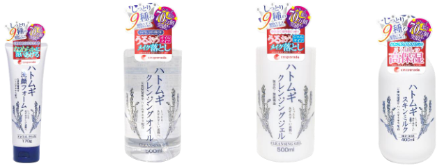 「ハトムギスキンケアシリーズ」では、肌を潤して整えるハトムギ種子エキスや9種のオーガニック植物エキスを配合している。洗顔料328円(税込み、以下同じ)、クレンジングオイル878円、クレンジングジェル878円、スキンミルク658円などをラインアップする。