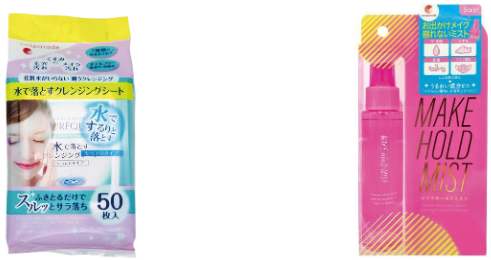 7種類の保湿成分配合で、化粧水なしでも潤う「ピュアクアウォータークレンジングシートしっとり」は50枚入りで328円。マスク擦れや汗や皮脂によるメイク崩れを防ぐ「メイクホールドミスト」は658円で販売する。