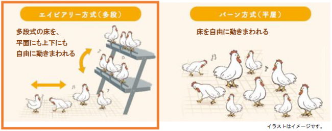 エイビアリーとは、ドイツやデンマークなどヨーロッパで進められている立体式のAviary(鶏舎)で飼育するシステム。止まり木を設置した休息エリア、巣箱を設置した産卵エリア、砂浴びのできる運動エリア等を備えた平飼い鶏舎で、鶏の行動がより多様になるように開発された。多段式にすることで、飼養羽数を増やすことができ、一般的に1㎡あたり9羽を飼育できるという。