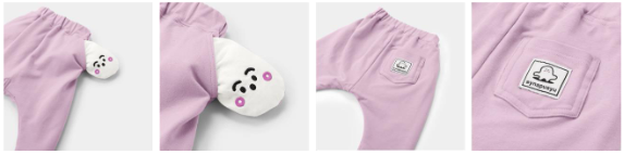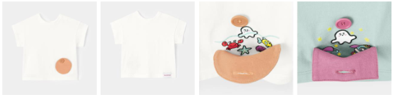 たとえば、Tシャツのポケットの内側にぷしゅぷしゅの刺繍があり、のぞくことで赤ちゃんの想像力がかきたてられるというなうな工夫だ。また、丸・三角・四角と3つの異なる形のポケットを付けて、赤ちゃんに形の違いを意識させる、大きなサイズのボタンを付けることで指先を活性化させる、子ども自身が着替ることを肯定できるように前後どちらでも着られるデザインになっているなど。