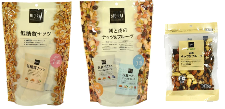 BIO-RAL低糖質ナッツは28g×7袋で698円(税込753円)、BIO-RAL朝と夜のナッツ&フルーツは20g×7袋で698円(税込753円)と個包装タイプ。BIO-RAL有機ナッツ&フルーツは105g398円(税込429円)。
