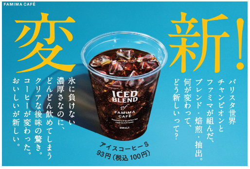 (株)ファミリーマート(東京都港区、細見研介社長)は6月15日(火)に、「FAMIMA CAFÉ」の主力商品「アイスコーヒー」を、世界チャンピオンのバリスタ粕谷哲(かすやてつ)氏との共同開発によってリニューアルし、全国のファミリーマート約1万6600店で販売する。また6月28日(月)まで、FAMIMA CAFÉ対象商品の購入者に、次回使える20円引きクーポンを発行するキャンペーンを実施する。