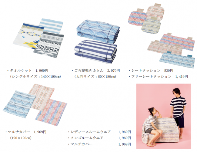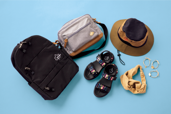 販売アイテムの一例として、リュック1969円(税込、以下同)、ショルダーバッグ1419円、ハット1419円、ヘアゴム539円、ターバン539円、サンダル 1969円などがある。