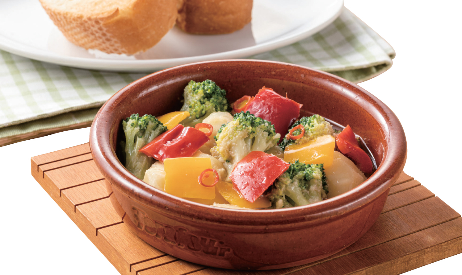 「特製アンチョビソースの彩り温サラダ」498円(税込537円)は、緑黄色野菜を野菜ごとに別々に調理することで、湯煎した時に一番おいしい状態を目指した。特製アンチョビソースが野菜に絡んでバケットやワインにも合う。パスタとソースとしても利用できる。