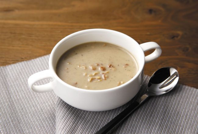 「マッシュルームとくるみのポタージュ」は、マッシュルームや生クリームなどを合わせて 濃厚な味わいに仕上げている。食感のアクセントとしてクラッシュしたくるみを加え、食べ応えもある。また、マッシュルームのペーストに黒トリュフを配合することで、 温めて袋から出した瞬間に香りが広がるという。