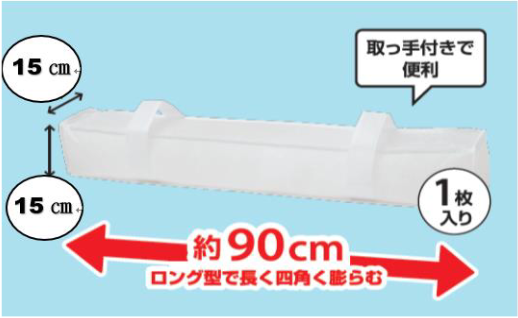 この土のう袋は、水に3~5分浸すだけで、重さ約15kg・太さ縦横約15cm・長さ約90cmのロングサイズに膨らむ。また、取手付きのため、持ち運びがしやすく、四角く膨らむ仕様となっている。使用前はコンパクトなので防災用品の備蓄にも場所をとらず、使用後は天日干しで乾燥させることで元のサイズに戻り、一般ごみとして処分することができる。縦約15cm×奥行約15cm×幅約90cm、税込価格1078円。