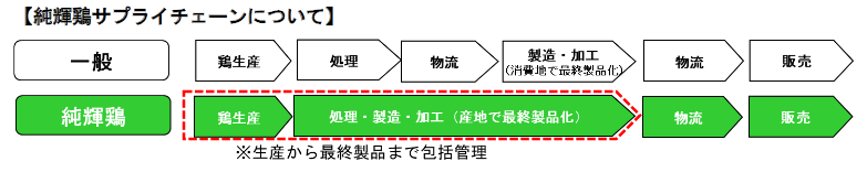 「トップバリュ グリーンアイナチュラル 純輝鶏」は2000年から販売している。イオンではさらなる鮮度・品質向上と品揃え拡大を目的として、純輝鶏のサプライチェーンの構築を進めてきた。青森・岐阜・広島・鹿児島の国内4カ所のパック工場と協業することで、工場で生産・商品化した“産地パック”を全国の店舗へ展開することが可能となった。また、これまで原料の処理・加工から店舗納品まで3日以上かかっていた工程は、最短で翌日に納品ができるようになった。