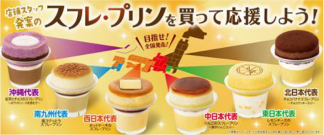 商品は、北日本エリア代表の「チョコバナナスフレ・プリン~チョコクッキー入り」298円(税込み、以下同じ)、東日本エリア代表の「レモンチーズのスフレ・プリン」298円、中日本エリア代表の「りんごのスフレ・プリン~焼きりんご入り~」330円、西日本エリア代表の「ホットケーキなスフレ・プリン」298円、南九州エリアの「塩コクっとうスフレ・プリン」、沖縄エリ代表アの「紅芋とチョコのスフレ・プリン~ホワイトソースを添えて~」298円の6種類。