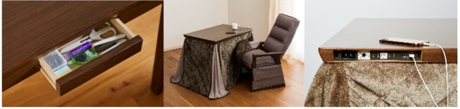 “イスに座ったまま温まる” 高脚こたつの側面に、コンセントやUSBコネクタがついているため、携帯電話の充電やパソコンの電源として使える。1人用には小物の整理に便利な “引き出し” が付いている。こたつとして使用しない時期は机として利用できる。1人用(90×60×68cm)は2万5800円、2人用(90×75×68cm)は2万7800円、4人用(135×80×68cm)は3万0800円。カラーはナチュラルとブラウン。