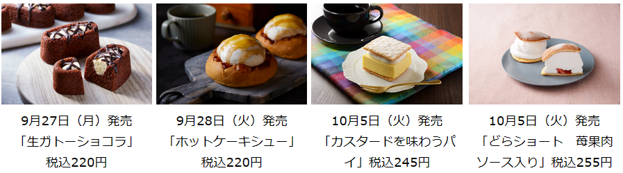(株)ローソン(東京都品川区、竹増貞信社長)は9月27日(月)から順次、「生ガトーショコラ」(税込220円、以下同)、「ホットケーキシュー」(220円)、「カスタードを味わうパイ」(245円)、「どらショート 苺果肉ソース入り」(255円)の4品を、全国のローソン店舗1万3980店(2021年8月現在)で発売する。