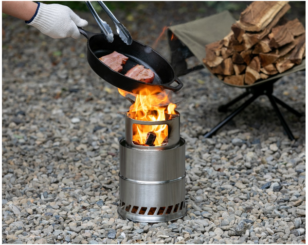 商品は焚き火台の中でも最近話題となっている二次燃焼ストーブ。二次燃焼ストーブの構造は、底部の通気口から取り込まれた空気が一次燃焼を起こし、温められた空気がさらに中空壁の隙間から上昇し、ストーブ上部の排気口から二次燃焼を起こすという高い燃焼効率構造を有する。また煙や灰が少ないのが特徴だ。