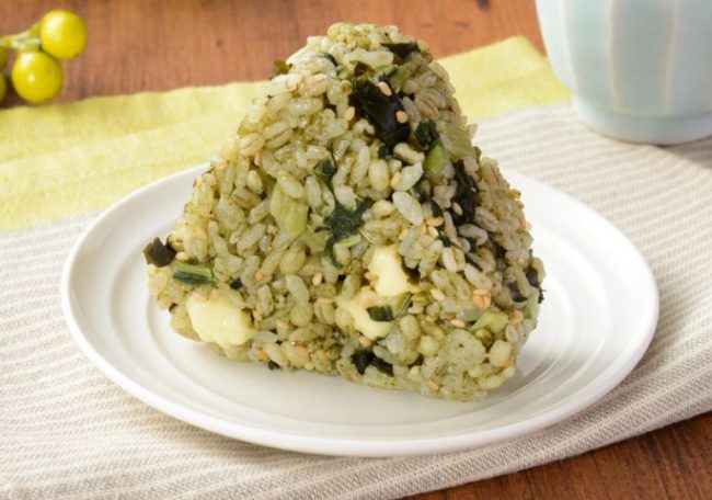 ビタミンや食物繊維などが豊富なケールのパウダー、チーズ、野沢菜などを、もち麦入りごはんに混ぜ込んだおにぎり。