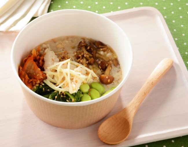 オートミールと雑穀をごはんの代わりに使用し、キムチ・針生姜・枝豆・なめこ・モロヘイヤ・鶏ささみなどの具材をトッピングした。豆乳とごまベースのスープで食べる弁当。