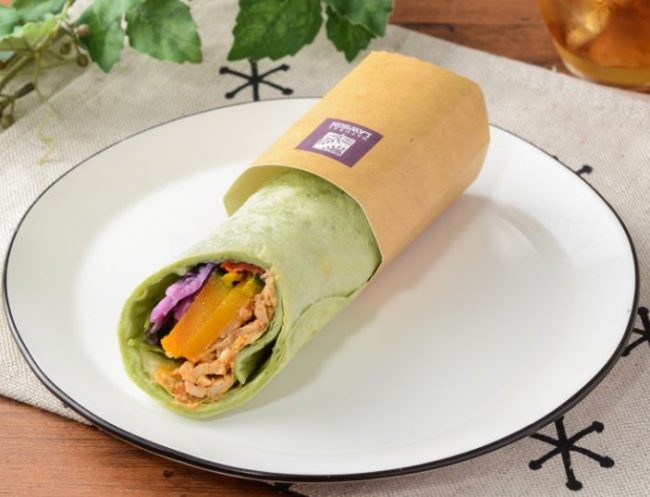 ひよこ豆からつくったフムスを、ケバブ風に味付けしたチキンや紫キャベツ、人参などと一緒にトルティーヤで巻いた。