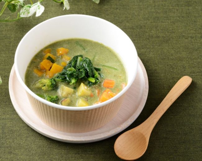 ほうれん草のピューレとケールパウダーでつくったスムージーに甘酒を加え、ブロッコリー・人参・かぼちゃ・ほうれん草・さつまいもなどをトッピングしたスープ。