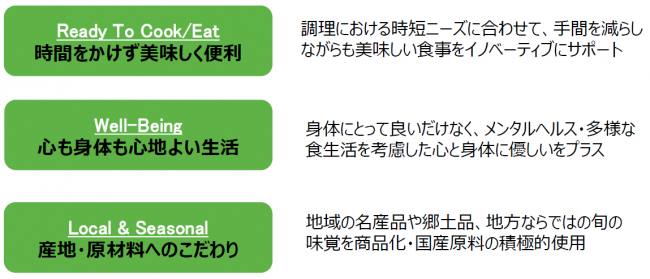 一つは「Ready To Eat & Cook~時間をかけず美味しく便利~」。二つ目は「Well-Being~心も身体も心地よい生活~」、三つ目は「 Local & Seasonal~産地・原材料へのこだわり~」。