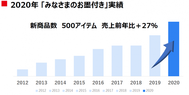 しかしコロナ禍で、節約志向や健康志向が高まったことを受け、2020年には糖質や栄養素にこだわったギルトフリーシリーズの菓子など、付加価値商品の開発を進めた。また商品投入数も500アイテムに上り、その結果、売上高は過去最高を達成し、2019年比で27%増と大きく伸長した。