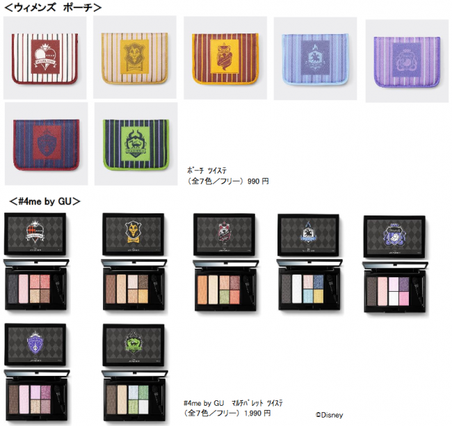 ディズニーツイステッドワンダーランドは、「不思議の国のアリス」や「ライオン・キング」「リトル・マーメイド」などのディズニーヴィランズ(悪役)の魂を持つキャラクターが登場する学園アドベンチャーゲーム。このゲームに登場する「ナイトレイブンカレッジ」の7寮の寮章をデザインしたウィメンズのパジャマ、ポーチと「#4me by GU」のマルチパレット計21型をラインアップする。