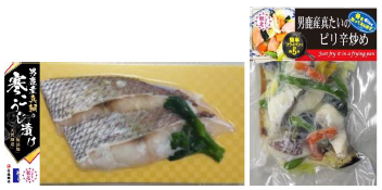 「男鹿産真鯛の寒こうじ漬け」と「男鹿産真鯛のピリ辛炒め」は、「にぎわい東北 フローズンフィッシュミールキット」の新メニューで、秋田県男鹿市の椿漁港で今年6月に水揚げされた3kg以上の大型の真鯛を使用して開発した。価格は498円(税抜き、以下同じ)。