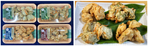 「にぎわい東北 三陸産スケソウタラ使用練り物ちぎり」は、今年1月~3月に三陸沖で漁獲され、宮城県石巻市の石巻港で水揚げされた三陸産スケソウタラをすり身の原料に使用し、宮城県塩釜市で4種類のフレーバーの練り物に加工したもの。