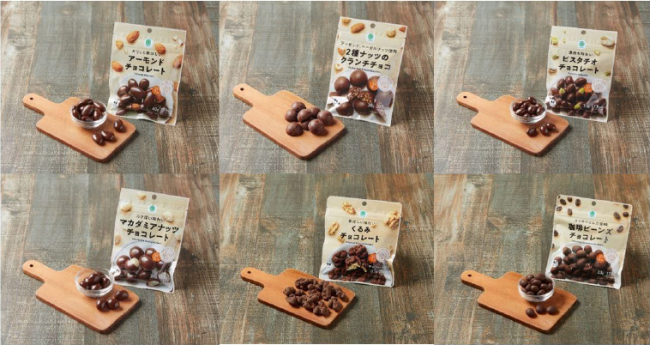 商品は「アーモンドチョコレート」「2種ナッツのクランチチョコ」「ピスタチオチョコレート」「マカダミアナッツチョコレート 」「くるみチョコレート」「珈琲ビーンズチョコレート」の6種類で、価格はいずれも184円(税抜き)。
