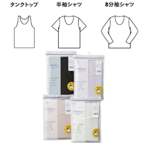 タンクトップ、半袖Uネック、8分袖Uネックの3バリエーション。サイズはM-L、L-LLの統合サイズ、カラーは白・黒・ピンク・パープルの4色、価格はすべて880円(税抜き)。