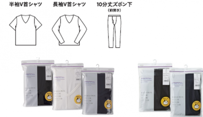 半袖Vネック、長袖Vネック、アウトゴムタイツ(10分丈)の3バリエーション。サイズはM-L、L-LLの統合サイズ、カラーは白・黒・ネイビーの3色、価格はすべて880円(税抜き)。